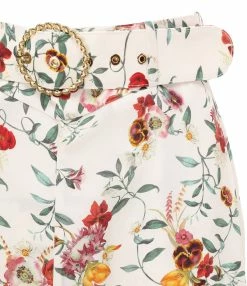 Mini short en lin blanc orné de motifs cachemire brodés dans des tons vert et bleu et de perles. Taille haute avec passants pour ceinture amovible assortie et décorée d’une boucle bijou. Braguette zippée et crochet. Deux poches italiennes. Coupe près du corps. Base arrondie. Doublé.