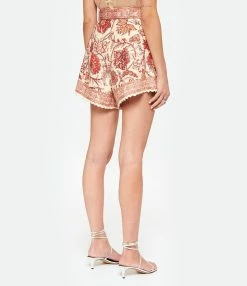 Short en lin blanc imprimé de motifs floraux dans des tons rouges. Taille haute avec passants pour ceinture amovible assortie décorée d’une boucle bijou. Fermeture zippée invisible dans le dos. Deux poches prises dans les coutures latérales sur le devant. Coupe droite. Base ornée de dentelles et de perles. Doublé.